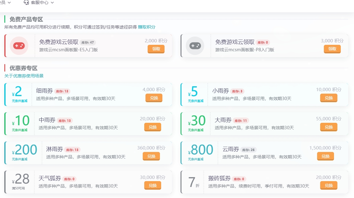 所有雨云用户都可以在积分中心兑换优惠券。在积分商城优惠券专区,除了可兑换优惠券外,还可以兑换实物。积分商城(每晚20:00随机刷新,不定期根据活动上新)。兑换优惠券需要积分,那么积分是什么?积分从何而来呢?这些问题请看下文『雨云积分怎么赚取』部分!