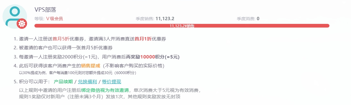 积分中心-赚取积分处完成相应任务赚取积分,比如每日签到、绑定微信、绑定邮箱、绑定QQ、绑定手机、关注雨云B站号、到淘宝店下单、淘宝好评等等。 - 推广赚积分。可以使用专属推广链接进行推广,每邀请一人注册奖励2000积分(1元),用户消费后再奖励10000积分(=5元),此后还可获得该客户消费产生的销售提成(10%-30%)。