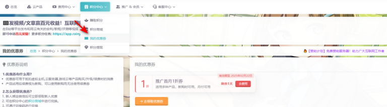 所有雨云用户注册后都可以赚取积分(2000积分=1元),积分可提现、在积分商城兑换优惠券等、续费服务器。赚取积分主要有以下几种方式: